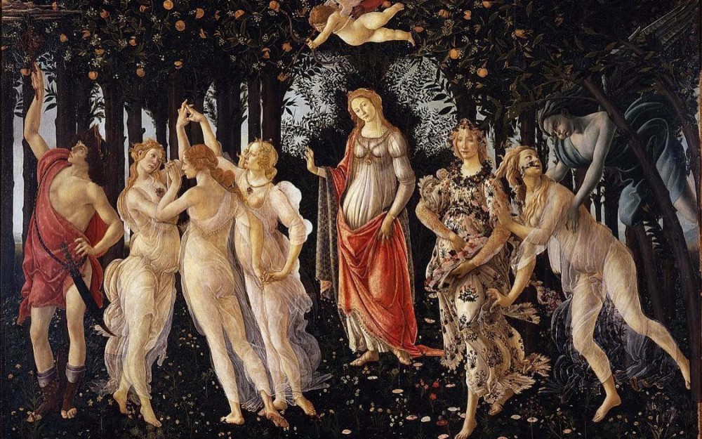 Mythological characters from left to right are Mercury, the Three Graces, Venus, Flora, Chloris, and Zephyrus.